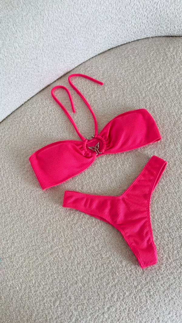 BIkini estilo strapless.. Se ata delicadamente en el cuello, complementado con un dije antialérgico en el centro del busto, ideal para pieles sensibles. La tela es texturada y aporta un detalle único, mientras que la bombacha es colaless corte en V.